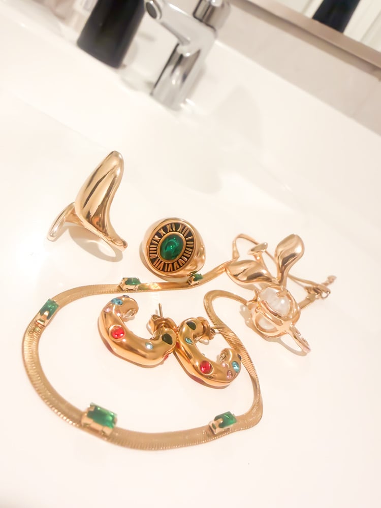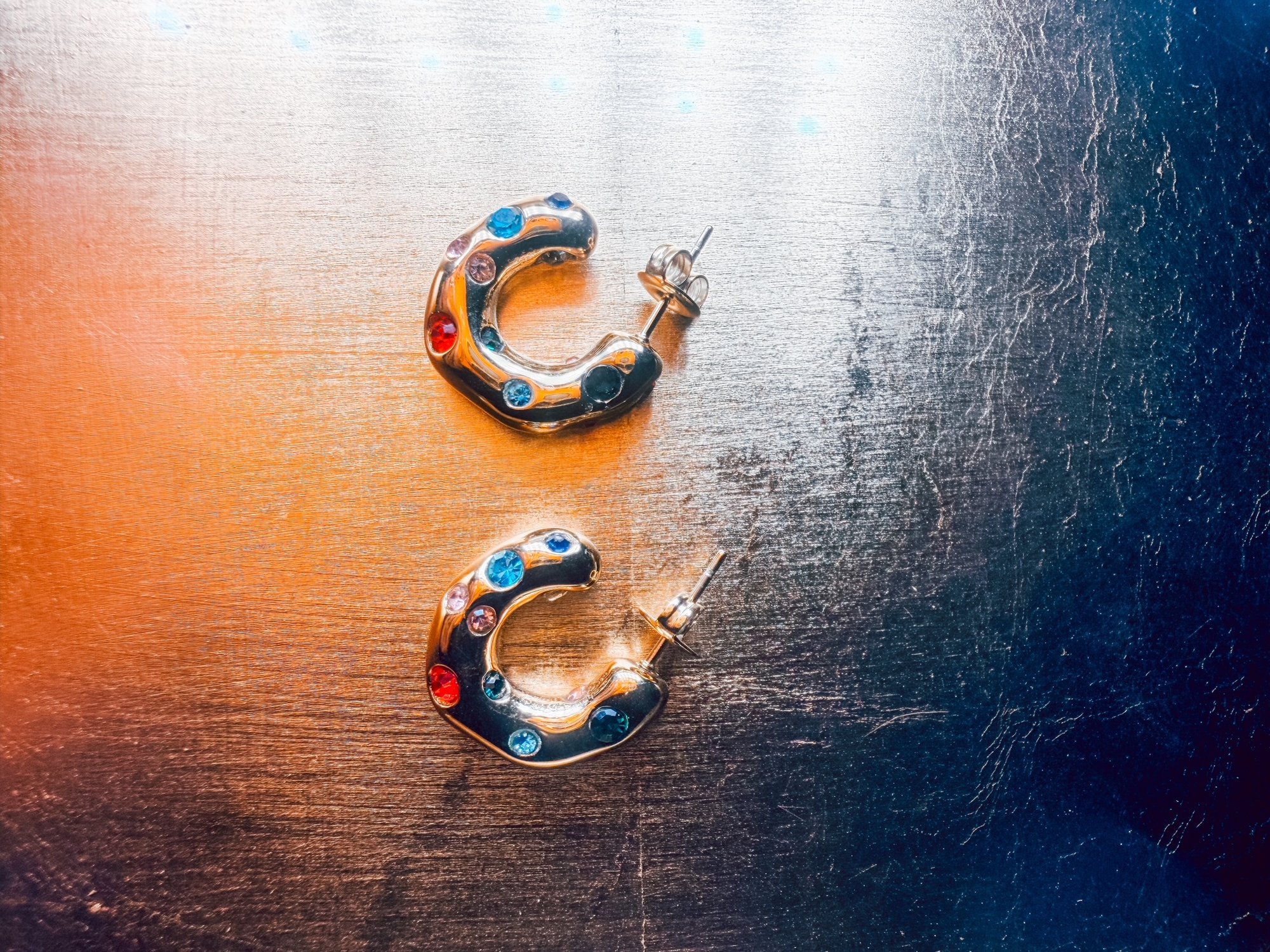 18K gold pated titanium earrings with multi-colored gemstones. They're gorgeous and have a nice weight to them.